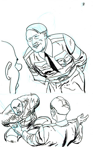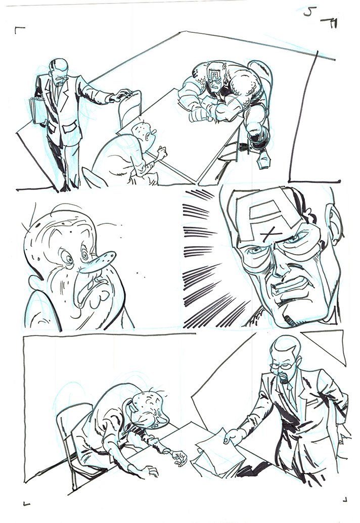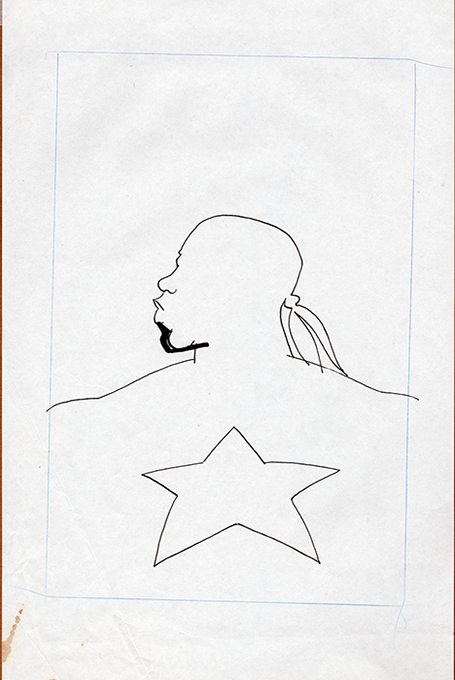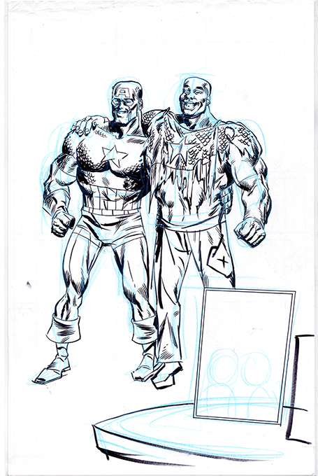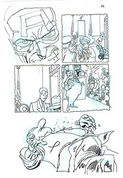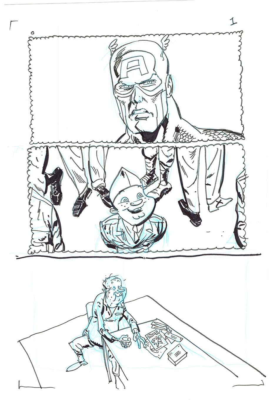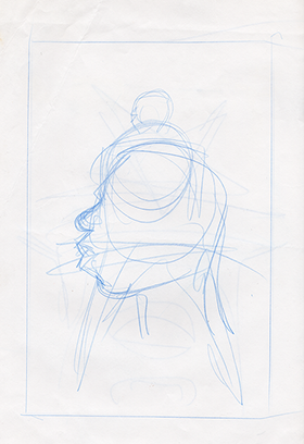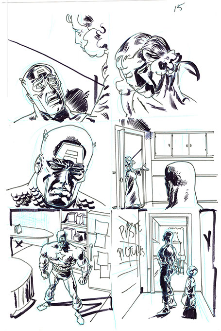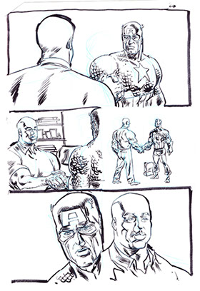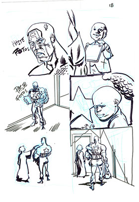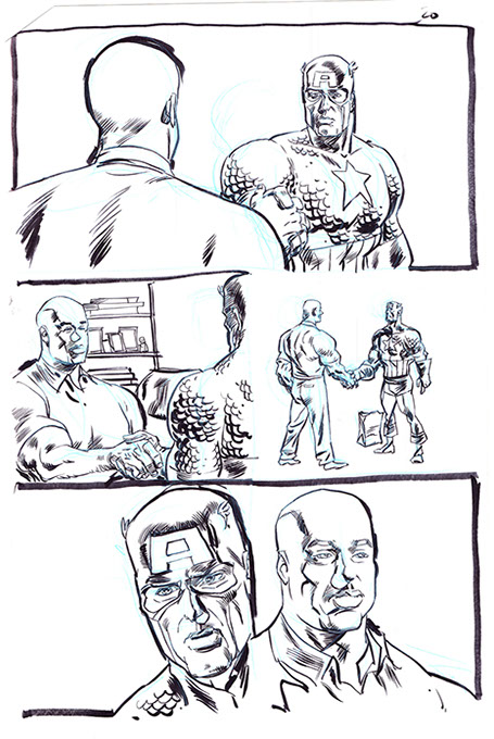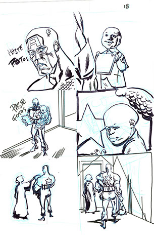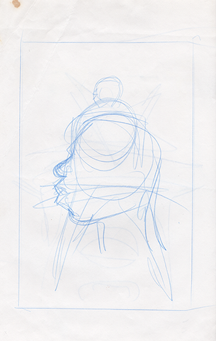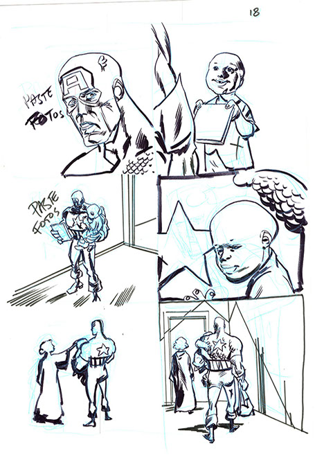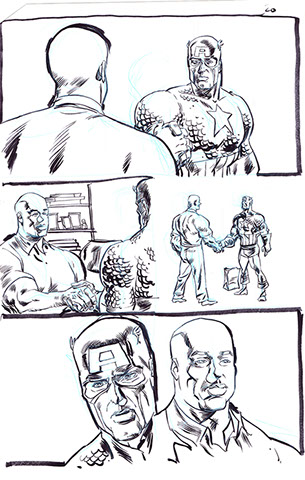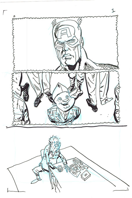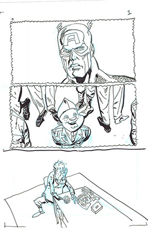 The now-iconic silhouette which adorned the first issue of Captain America's TRUTH series was drawn in about 15 minutes on a sheet of legal-sized xerox paper with no initial pencilling other than the frame which was traced by laying a comic on the paper. Once the line art was scanned, it was filled in in Photoshop.