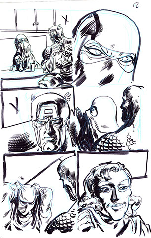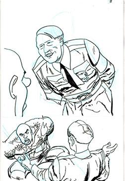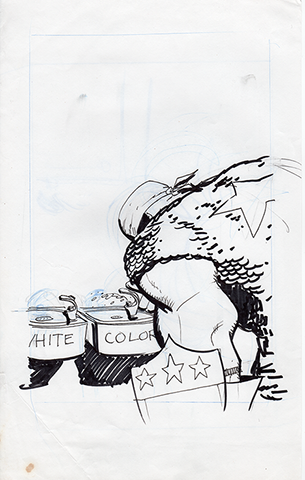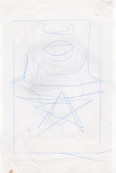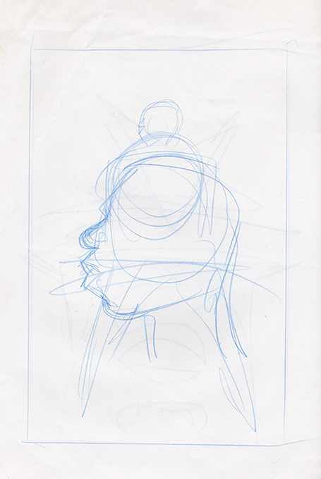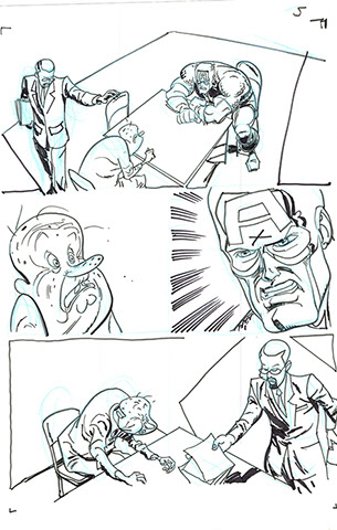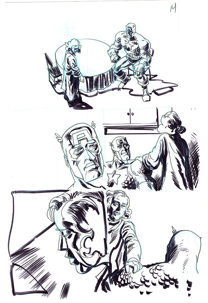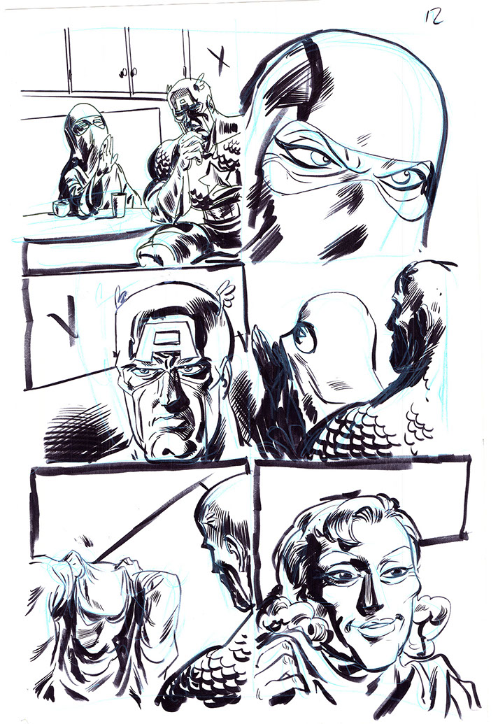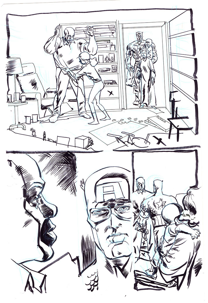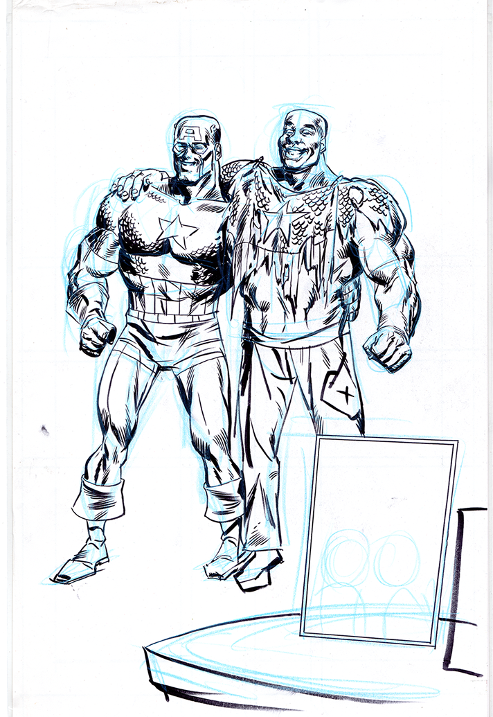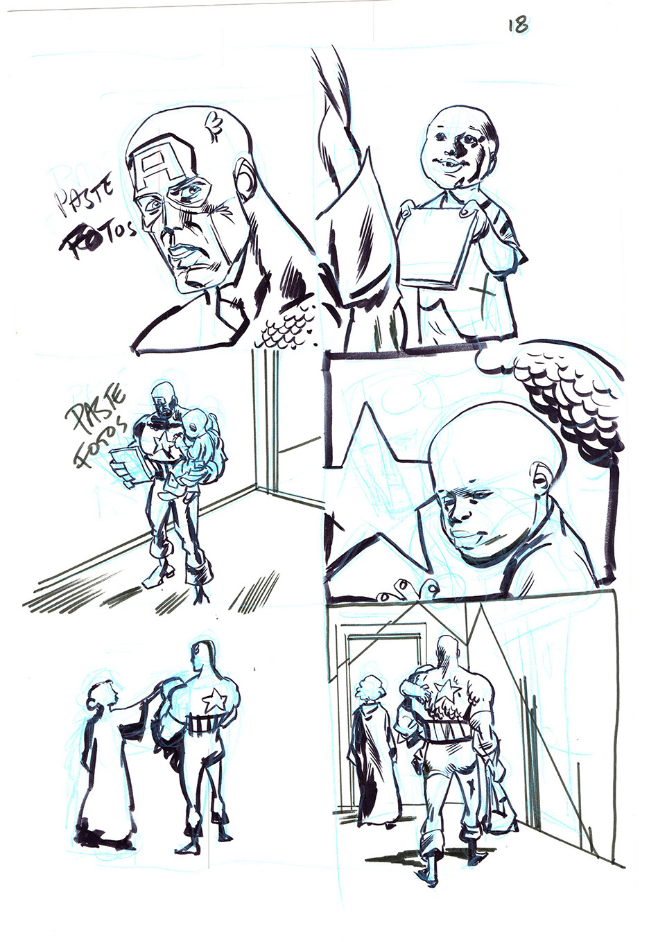 The now-iconic silhouette which adorned the first issue of Captain America's TRUTH series was drawn in about 15 minutes on a sheet of legal-sized xerox paper with no initial pencilling other than the frame which was traced by laying a comic on the paper. Once the line art was scanned, it was filled in in Photoshop.