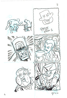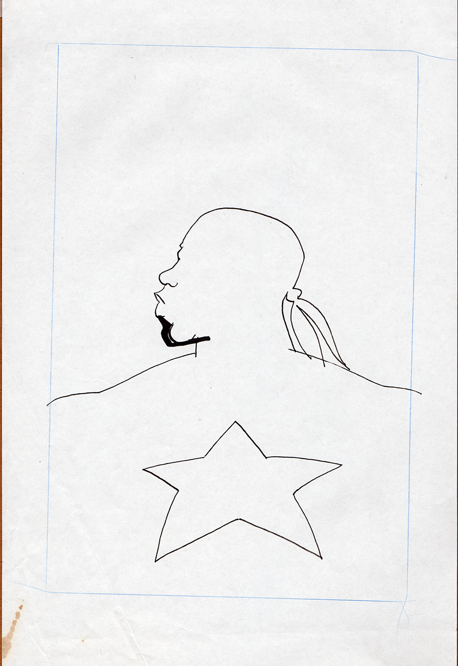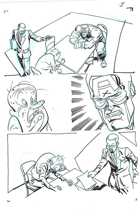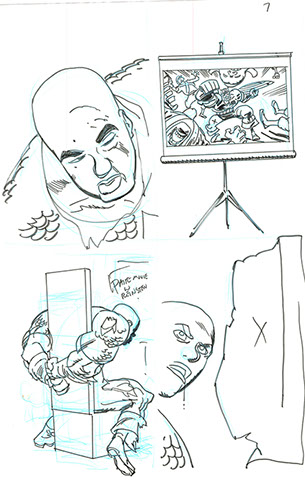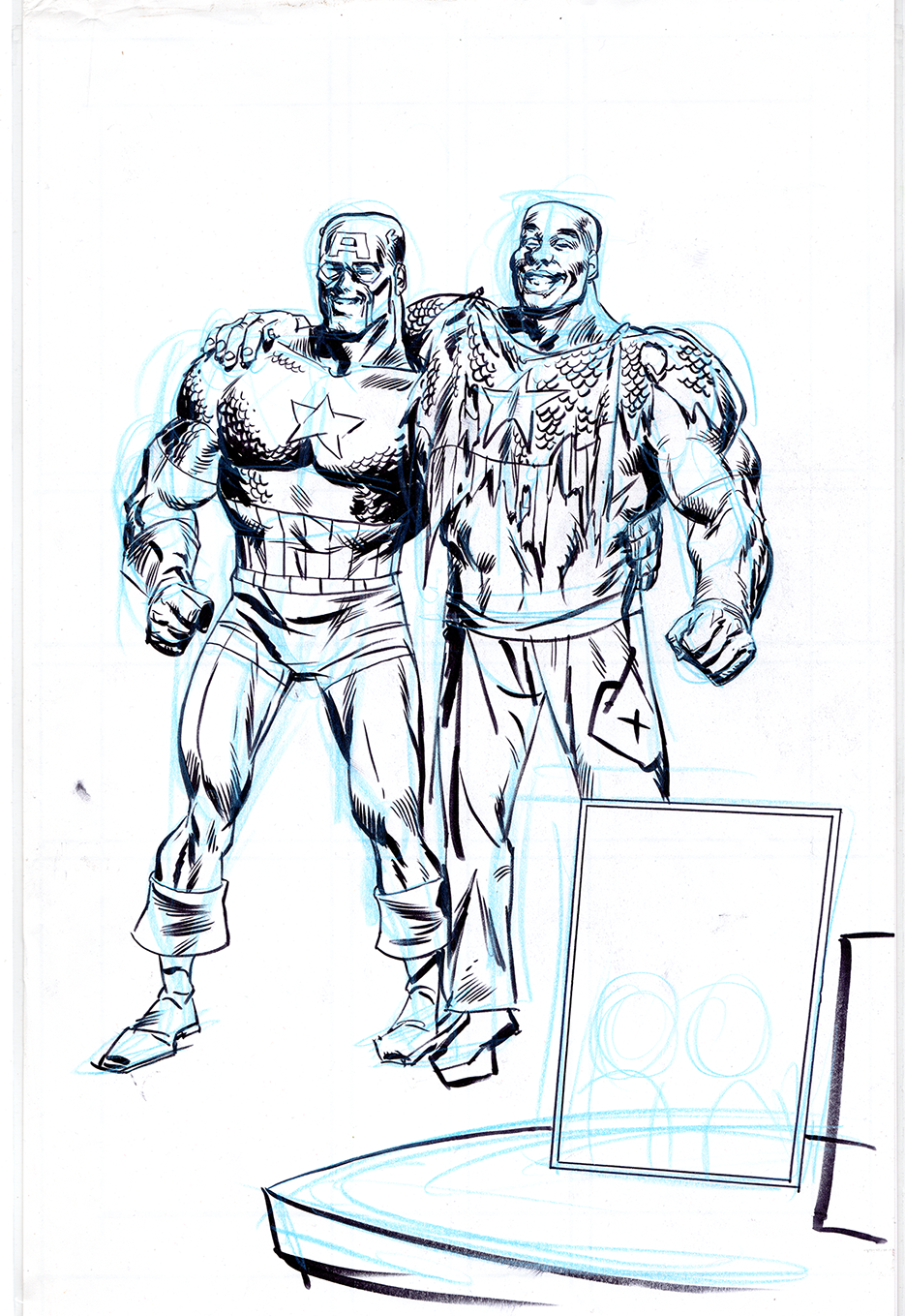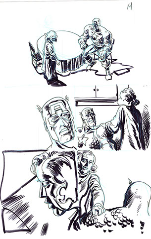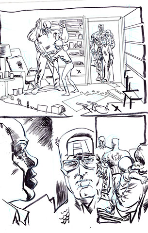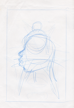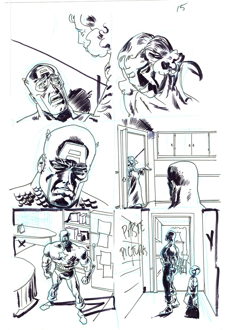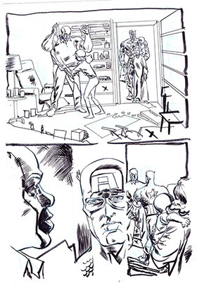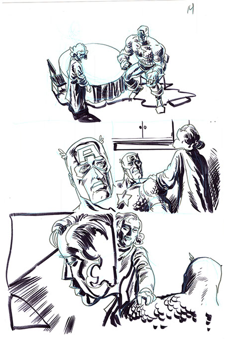 The now-iconic silhouette which adorned the first issue of Captain America's TRUTH series was drawn in about 15 minutes on a sheet of legal-sized xerox paper with no initial pencilling other than the frame which was traced by laying a comic on the paper. Once the line art was scanned, it was filled in in Photoshop.